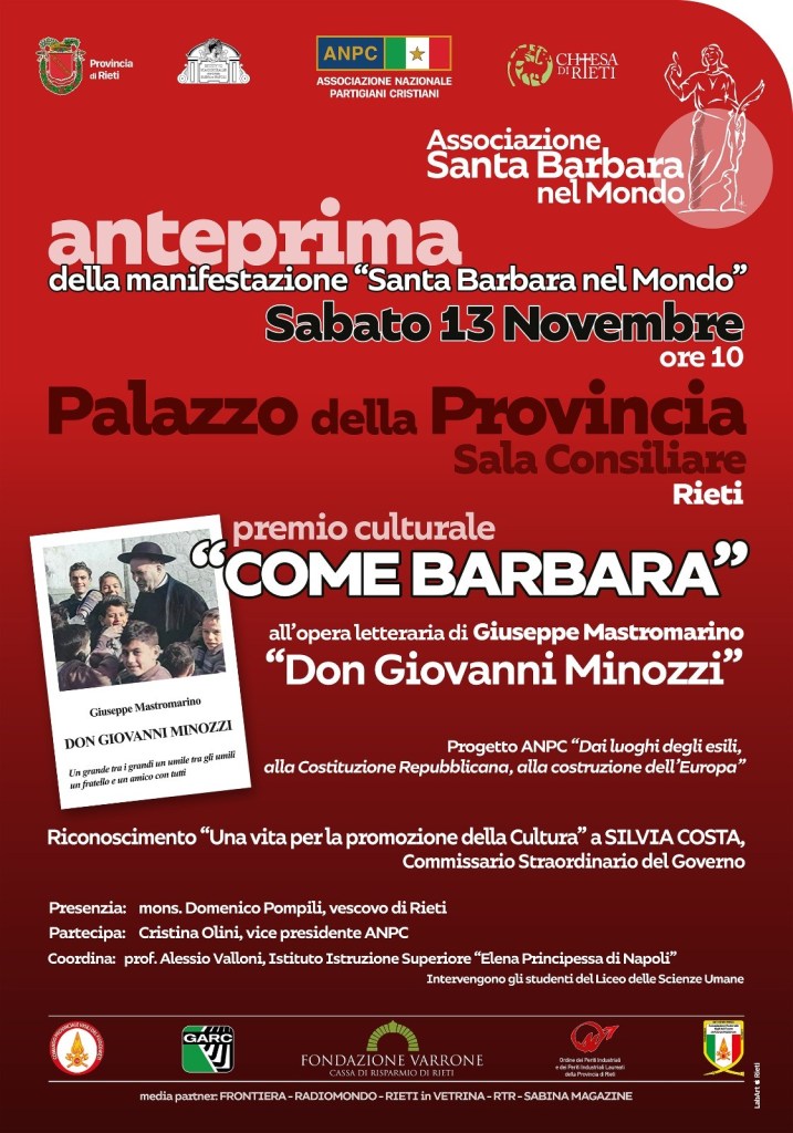 “Con la festa della patrona della diocesi e della città di Rieti che si avvicina, si fanno più intense le attività dell’associazione Santa Barbara nel Mondo. Per sabato 13 novembre è infatti in programma un’anteprima della manifestazione che ogni anno anima il territorio con premi e proposte culturali. Dalle ore 10, nella sala consiliare del palazzo della Provincia, sarà presentata l’opera letteraria di Giuseppe Mastromarino “Don Giovanni Minozzi”, alla quale l’associazione guidata da Pino Strinati ha assegnato il premio “Come Barbara”. Nell’occasione si parlerà anche del progetto dell’Associazione Nazionale Partigiani Cristiani “Dai luoghi degli esili, alla Costituzione Repubblicana, alla costruzione dell’Europa”. L’evento offrirà anche spazio al riconoscimento “Una vita per la promozione della Cultura”, che sarà conferito a Silvia Costa, vice presidente Associazione Nazionale Partigiani Cristiani”. (Pubblicato su: su Frontiera settimanale Rieti).